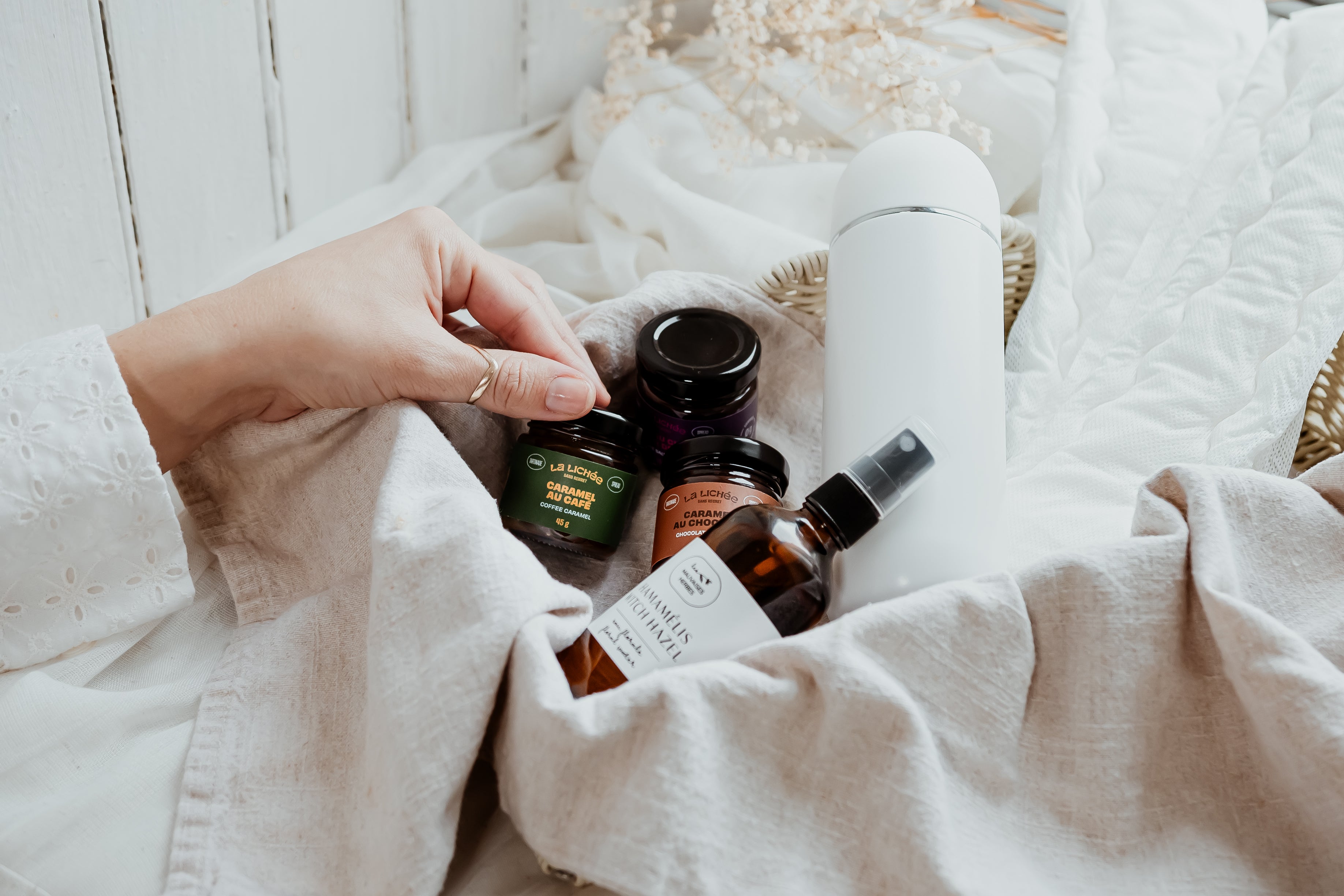 La Box Essentiel contient les essentiels pour ton confort post-partum (bidet portatif, hydrolat d'hamamélis, trio de caramels et serviettes de maternité).